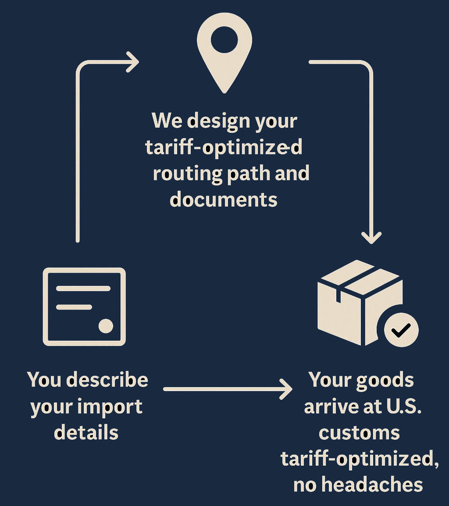 Re-route your supply chain via Dubai, Vietnam or Turkey and reduce tariffs by up to 80%—no supplier changes, no headaches.